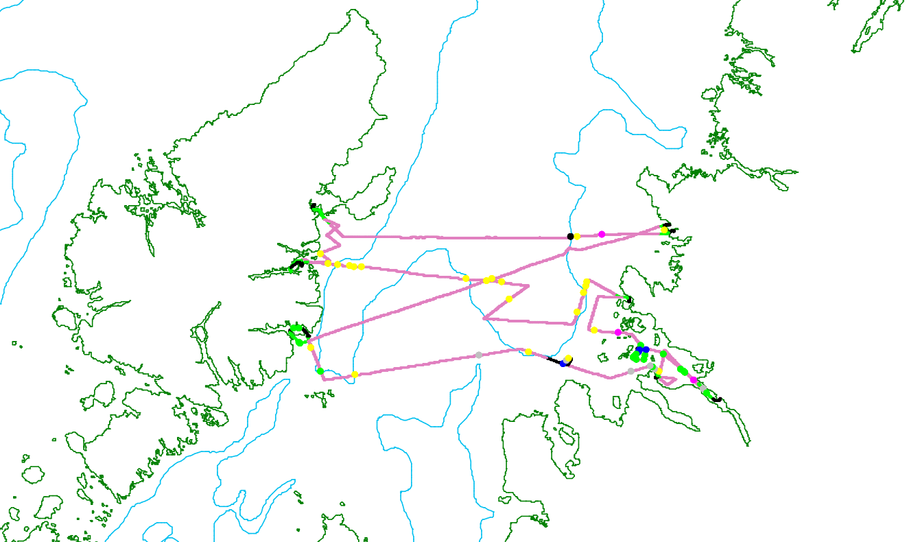 At this stage in the season, our focus is on filling gaps in our survey transects, so we set out with the goal of surveying back and forth across the Minch to strengthen our dataset. For much of the week, choppy seas made spotting animals a challenge, but persistence paid off.