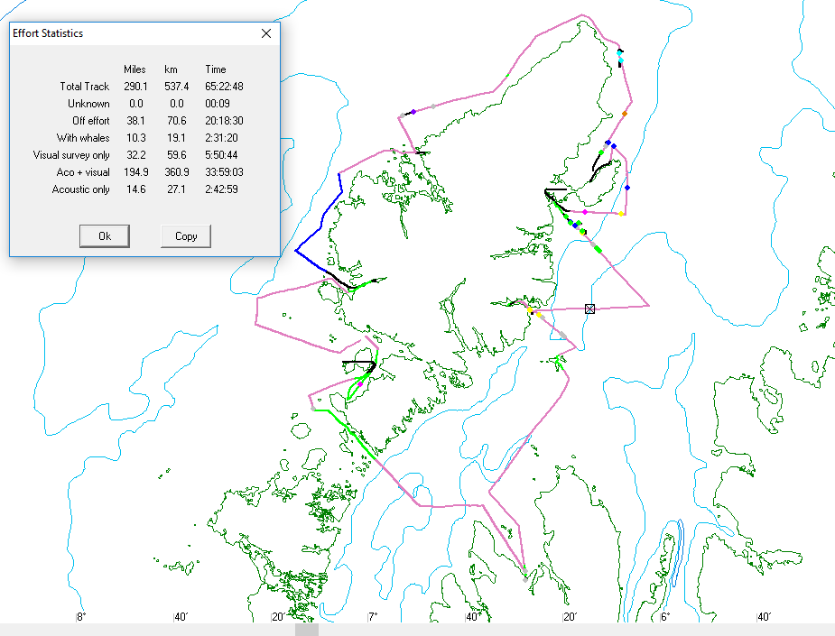 The whale continued feeding for a short while before we decided to move on. Plenty more porpoise were followed by another minke, this one much smaller at only around 6 metre. All these sightings stretched the last bit of the journey from a 30 minute voyage into around 3 hours! After an enjoyable last day, we finally made it back into Stornoway for well earned meal in a local eatery having after a bouncy week circumnavigating Lewis and surveying several hundred miles over the week.