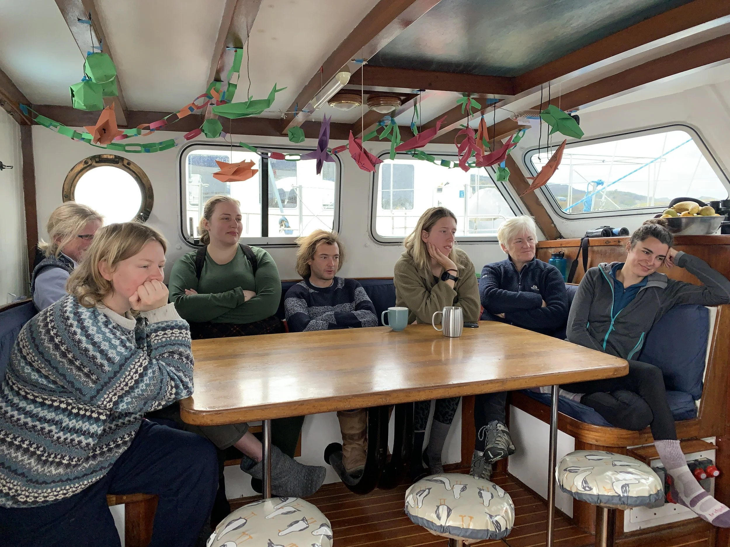 We awoke to a very wet Craobh Haven Marnina but some got to enjoy a long hot shower ashore, with others not being so lucky with dodgy showers. Our stormbound day started with a talk by Emily Hague on the impacts of different vessel noises on marine mammals followed by attempting to match our bottlenose dolphin sightings from yesterday to those in the catalogue. This turned out to be a lot trickier than expected so we look forward to hearing from Dr Lauren if there has been a match! Our knowledge gained in the week was then put to the test in Hannah’s quiz, consisting of 3 rounds: HWDT, the Hebrides and music intros of sea-related songs. Turns out, not all lighthouses are named ‘George’ and have alternative names such as Skerryvore or Ardnamurchan and we should have paid more attention over the previous week.